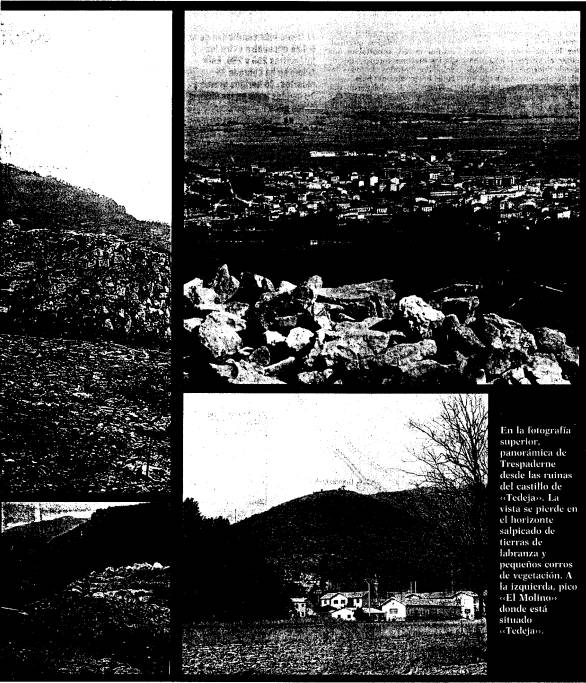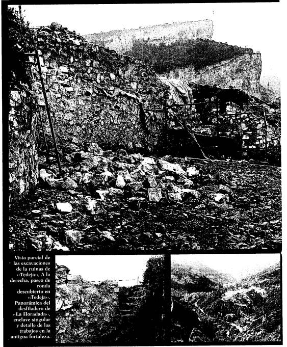 ENTIDAD CIENTIFICA Siete años después localizado el lugar, en septiembre de 1988, Fernández Ruiz fundaba con otras 10 personas la asociación socio-cultural «Tedeja». La agrupación solicita un campo de trabajo y subvenciones para «catar» el lugar encontrado, pero le son denegadas un año tras otro. La administración requiere que el proyecto de excavación sea avalado por una entidad científica. Desde 1994, es el Área de Conocimiento de Historia Medieval de la Facultad ,de Humanidades y Educación de la Universidad de Burgos la institución que investiga el yacimiento. La asociación cultural abrió camino, desbrozó y limpió el Con «Tedeja» Trespaderne supera el complejo de considerarse un pueblo sin historia lugar, palpó los límites de la fortaleza, recuperó una fuente en la subida a «Tedeja», y además tuvo tiempo de restaurar con una ayuda económica de la central nuclear, la casa estación del ferrocarril Santander-Mediterráneo, convertido hoy en un albergue donde se alojan los campos de trabajo desde 1992 vienen a excavar en «Tedeja» En la actualidad, con un centenar de socios y tras una importante escisión sufrida hace años, la asociación está centrada exclusivamente en los trabajos de excavación, en el pico «El Molino», Trabajos que están dando ya sus frutos. INTERES HISTORICO «Tedeja» es una escarpada defensa natural y un mirador privilegiado. Esta situado en un lugar estratégico, sobre un monte cónico recortado en su base por los ríos Ebro y Nela, desde el que se divisa todo el desfiladero de «La Horadada», paso natural de la meseta castellana a los puertos del cantábrico Ramón Bohigas (Santander), José Angel Lecanda (Bilbao) e Ignacio Ruiz (Burgos), tres arqueólogos adscritos a la Universidad de Burgos que trabajan en Tedeja creen que «el lugar tiene antecedentes previos a la Alta Edad Media» "Como castillo debió ser, allá por Los hallazgos de este verano confirman el protagonismo de este punto estratégico entre los s. VII y XII los siglos IX y X, un centro geopolitico de máxima importancia. Su construcción puede estar vinculada a las promovidas por AIfonso I de Asturias para guarnecer la frontera oriental de su reino. Es una hipótesis razonable». Otros yacimientos visigodos aparecidos en pocos kilómetros alrededor de «Tedeja» «<Santa María», en Mijangos; «San Juan de la Hoz», en Cillaperlata; los eremitorios de Tartalés de Cilla y la ermita de «Santa María |